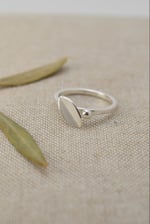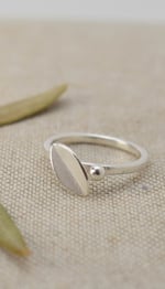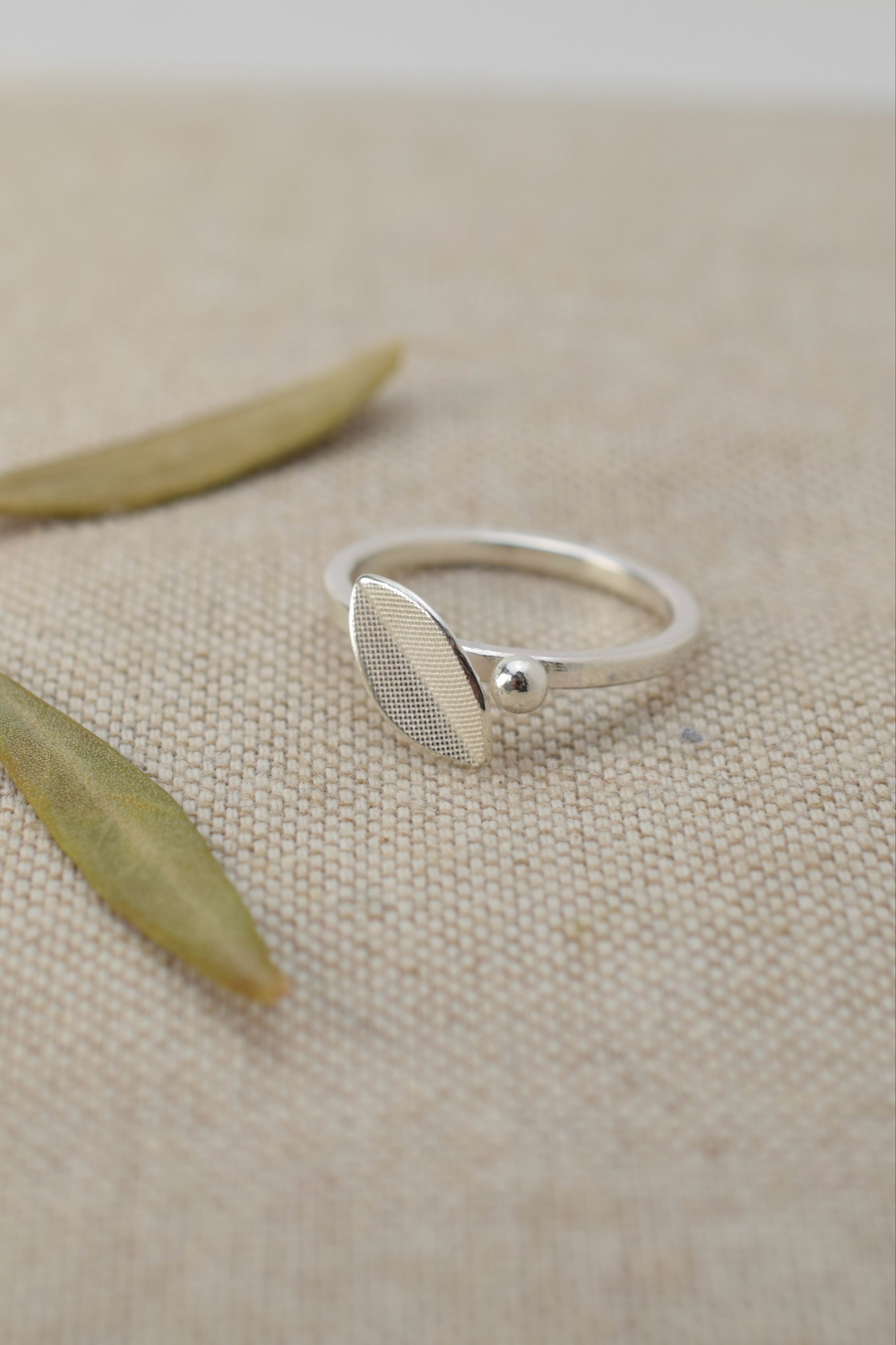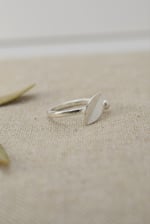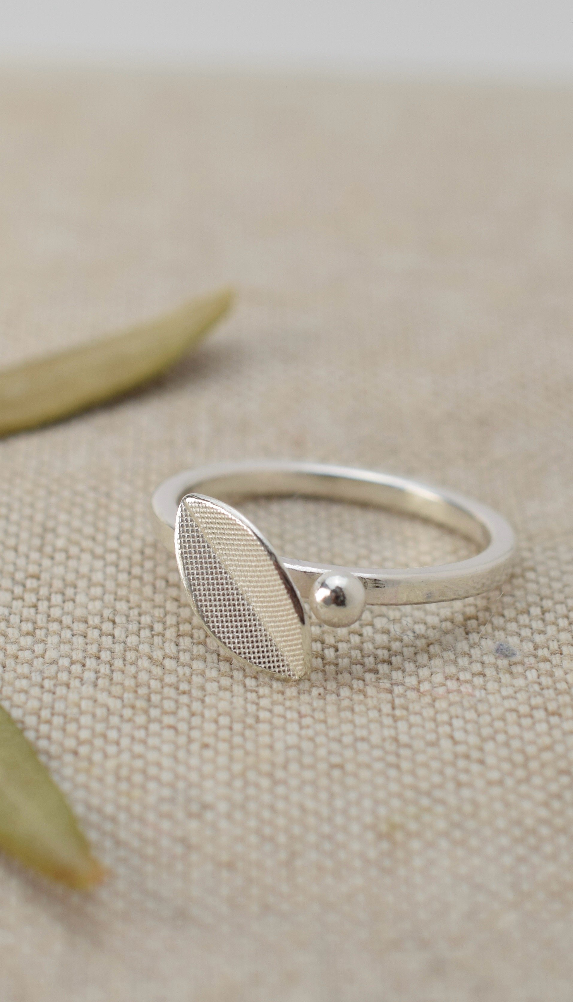 Custom Silver Leaf Ring from the Fold Collection. Crafted from eco-friendly recycled silver, this beautiful ring features a delicate leaf design with a central fold, textured with a fine mesh that gives it a soft matte finish. A small, polished silver ball sits beside the leaf, adding a modern touch to the organic shape. Handmade to order, this custom ring is made to your exact size for a perfect fit. Each piece is carefully crafted and dispatched within 7 days of your order. Ideal for those who appreciate unique, nature-inspired jewellery, this sustainable silver ring is both timeless and eco-conscious. Please note that custom orders may require additional time to ensure a perfect, personalized fit.