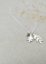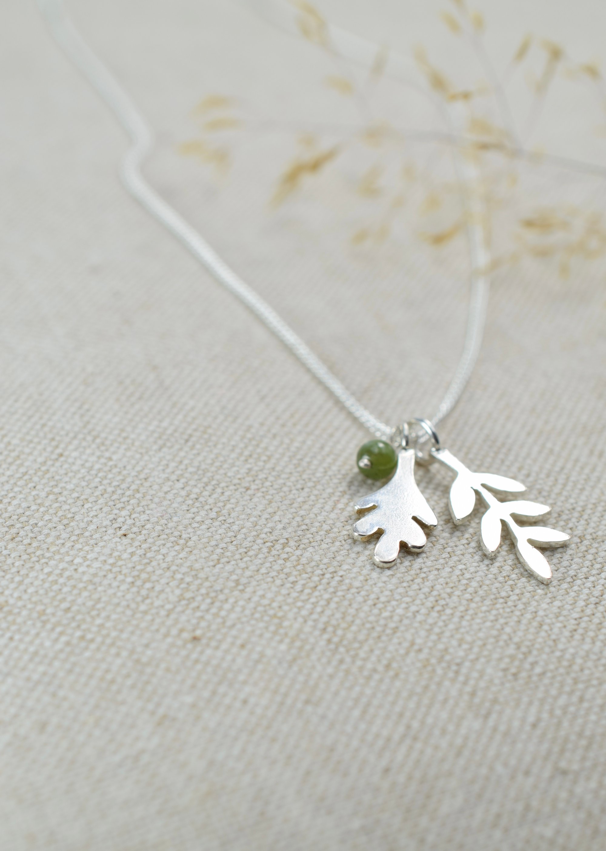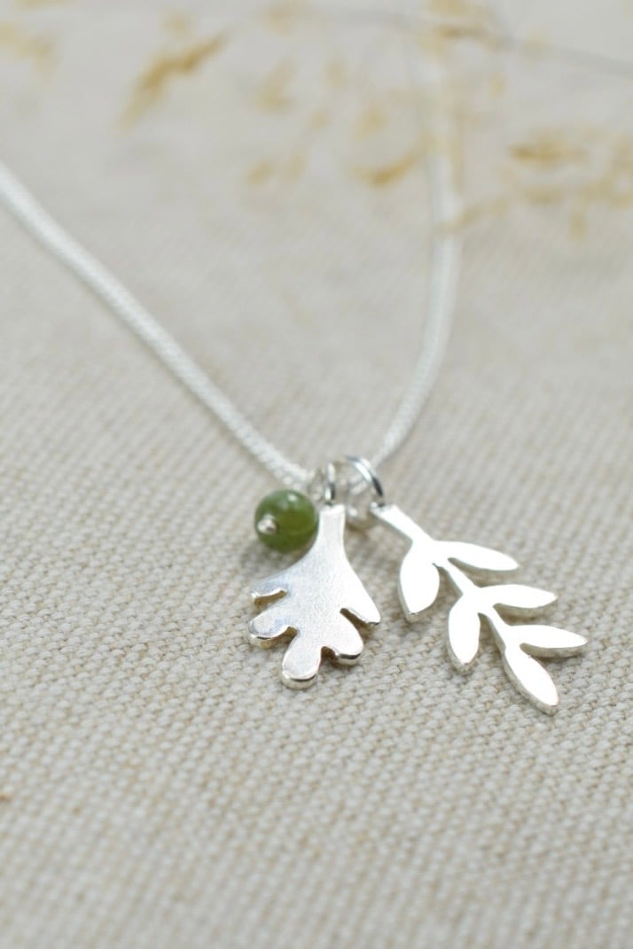 A silver rowan leaf and an oak leaf with a green agate semiprecious stone bead on a choice of 16" (40 cm) or 18" (45 cm) chain.